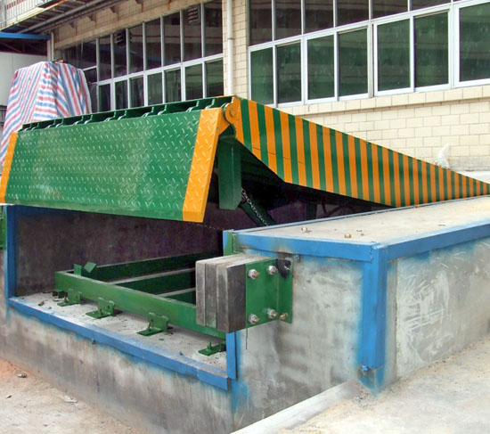 定义: 货台高度调节板是工业物流搬运与装卸的辅助设备之一。通常(嵌入)安装于装卸货码头中,起到调节装卸货码头与运输卡车之间的高度差和间隙。保障搬运工具(如机动叉车或手动液压托盘搬运车)能够畅通无阻地出入卡车车厢进行物料的装卸工作。 结构与工作原理: 结构:主要有三个部分,底座、承载板和动力系统。 底座与装卸货台固定,承载板分主板与搭板,使用时由动力系统升起主板,在主